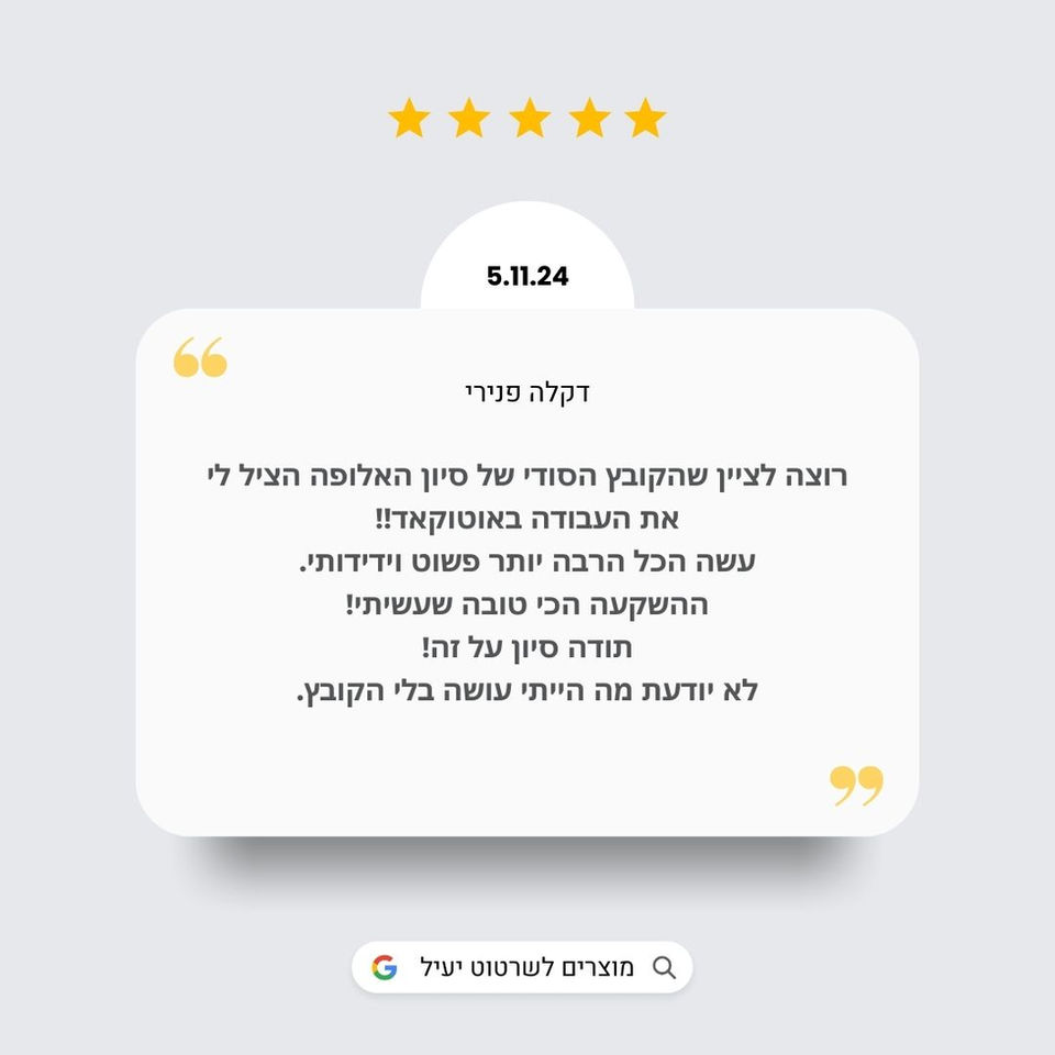 ואת הקובץ יצרתי בגלל סיבה אחת בלבד - כדי לפנות לך זמן יקר, מתוך ההבנה שכל דקה שנחסכת שווה זהב!